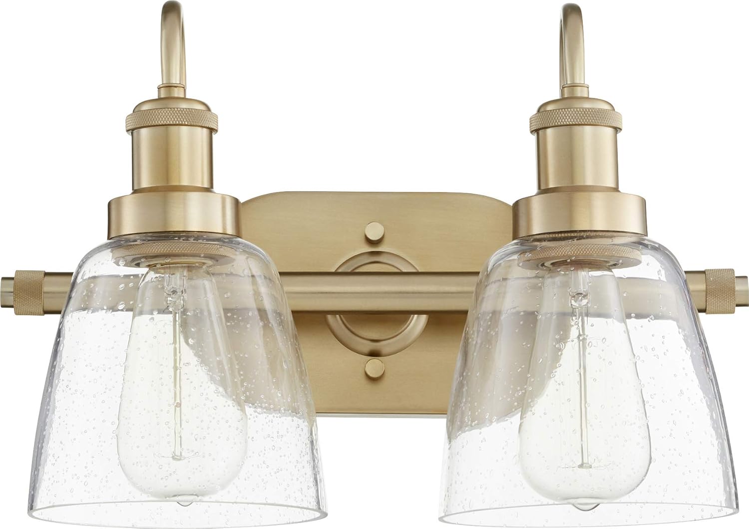 Quorum 508-2-80 Transitional Two Light Vanity in Brass - Antique finish . Two Light Vanity from the . Height: 10.50 inches Width: 17.75 inches. Style: Transitional Light Type: Vanity Finish: Aged Brass. Safety Rating: Damp and Safety Listing: Damp.